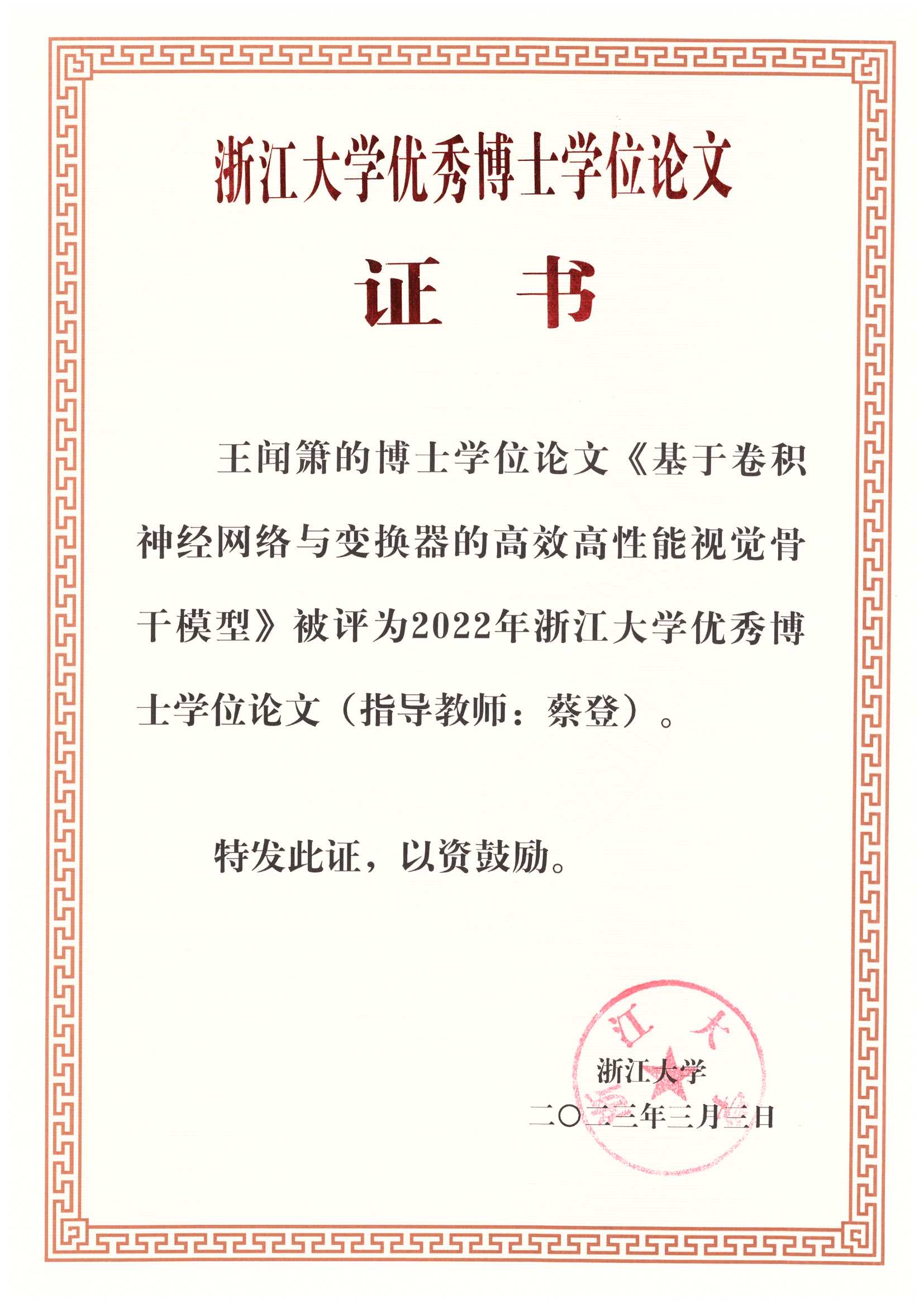 近日,学校发布2022年浙江大学优秀博士学位论文名单,我院4篇博士学位论文获评“优秀博士学位论文”,分别是2022届计算机科学与技术专业博士毕业生张培歆的博士学位论文《深度神经网络的自动化公平性测试》,指导教师为王新宇教授;2022届计算机科学与技术专业博士毕业生王闻箫的博士学位论文《基于卷积神经网络与变换器的高效高性能视觉骨干模型》,指导教师为蔡登教授;2022届计算机科学与技术专业毕业生许佳敏的博士学位论文《面向三维重建与绘制的高效表达方法研究》,指导教师为鲍虎军教授。2022届设计学专业毕业生周志斌的博士学位论文《智能产品的概念设计方法与支持工具研究》,指导教师为孙凌云教授。