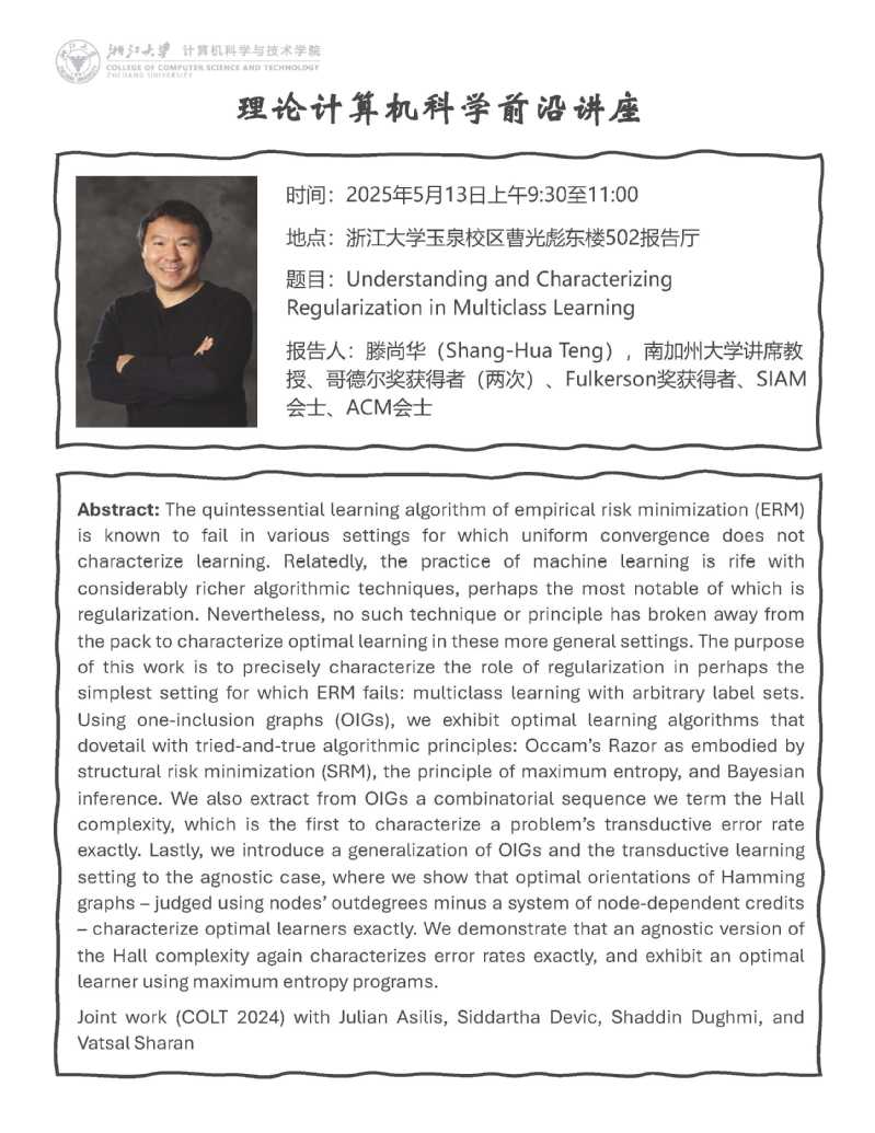 Dr. Shang-Hua Teng has twice won the prestigious Gödel Prize in theoretical computer science, first in 2008, for developing the theory of smoothed analysis, and then in 2015, for designing the groundbreaking nearly-linear time Laplacian solver for network systems. Both are joint work with Dan Spielman of Yale --- his long-time collaborator. Smoothed analysis is fundamental for modeling and analyzing practical algorithms, and the Laplacian paradigm has since led to several breakthroughs in network analysis, matrix computation, and optimization. Citing him as, ``one of the most original theoretical computer scientists in the world'', the Simons Foundation named Teng a 2014 Simons Investigator, for pursuing long-term curiosity-driven fundamental research. He and his collaborators also received the best paper award at ACM Symposium on Theory of Computing (STOC) for what's considered to be the ``first improvement in 10 years'' of a fundamental optimization problem --- the computation of maximum flows and minimum cuts in a network. His manuscript, Scalable Algorithms for Data and Network Analysis, received Phi Kappa Phi Faculty Recognition Award in 2020. In addition, he is known for his joint work with Xi Chen and Xiaotie Deng that characterized the complexity for computing an approximate Nash equilibrium in game theory, and his joint papers on market equilibria in computational economics. He and his collaborators also pioneered the development of well-shaped Dalaunay meshing algorithms for arbitrary three-dimensional geometric domains, which settled a long-term open problem in numerical simulation, also a fundamental problem in computer graphics. Software based on this development was used at the University of Illinois for the simulation of advanced rockets. Teng is also interested in mathematical board games. With his former Ph.D. student Kyle Burke, he designed and analyzed a game called Atropos , which is played on the Sperner's triangle and based on the beautiful, celebrated Sperner's Lemma. In 2000 at UIUC, Teng was named on the List of Teachers Ranked as Excellent by Their Students for his class, ``Network Security and Cryptography''. He has worked and consulted for Microsoft Research, Akamai, IBM Almaden Research Center, Intel Corporation, Xerox PARC, and NASA Ames Research Center, for which he received fifteen patents for his work on compiler optimization, Internet technology, and social network.