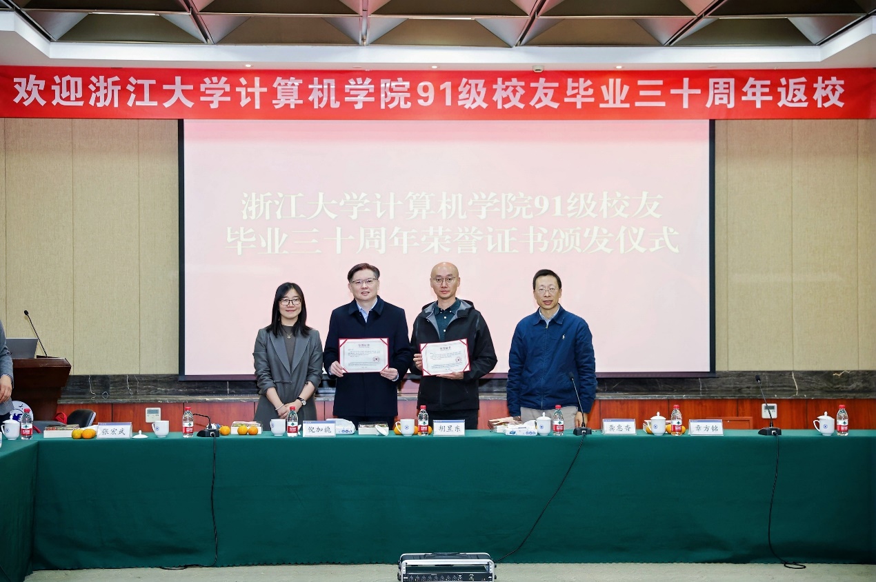胡昱东书记和倪加旎副书记给校友代表颁发“毕业三十周年荣誉证书”