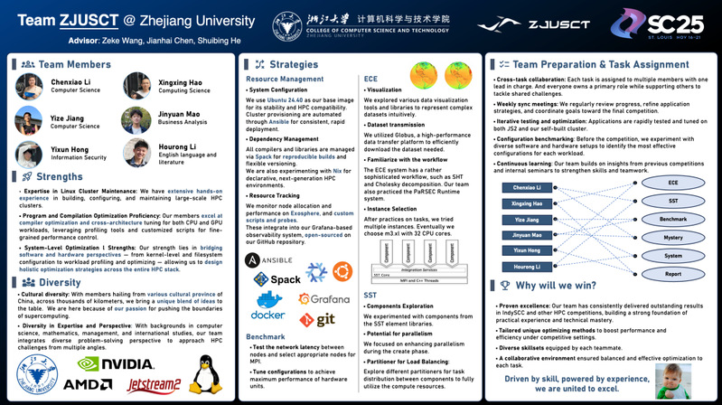 本届浙江大学超算队参赛队由计算机科学与技术学院的李晨潇、蒋翼泽、洪奕迅,数学科学学院的郝星星,外国语学院的李厚融与管理学院的茅晋源组成,由陈建海副教授、王则可百人计划研究员、张寅教授、何水兵长聘教授、庄博涵百人计划研究员指导。这支由多学科背景本科生组成的团队,在 46 小时线上决赛中展现了扎实的技术积累和卓越的团队协作能力。