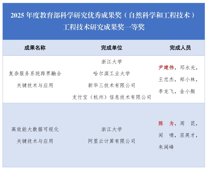 近日,教育部颁发了2025年度科学研究优秀成果奖(自然科学和工程技术)。浙江大学计算机科学与技术学院尹建伟教授牵头的“复杂服务系统跨界融合关键技术与应用”项目(尹建伟、邓水光、王忠杰、郑小林、李龙飞、金小艇)、陈为教授牵头的“高效能大数据可视化关键技术与应用”项目(陈为、周昆、闻啸、巫英才、朱闽峰)双双荣获工程技术研究成果奖一等奖。